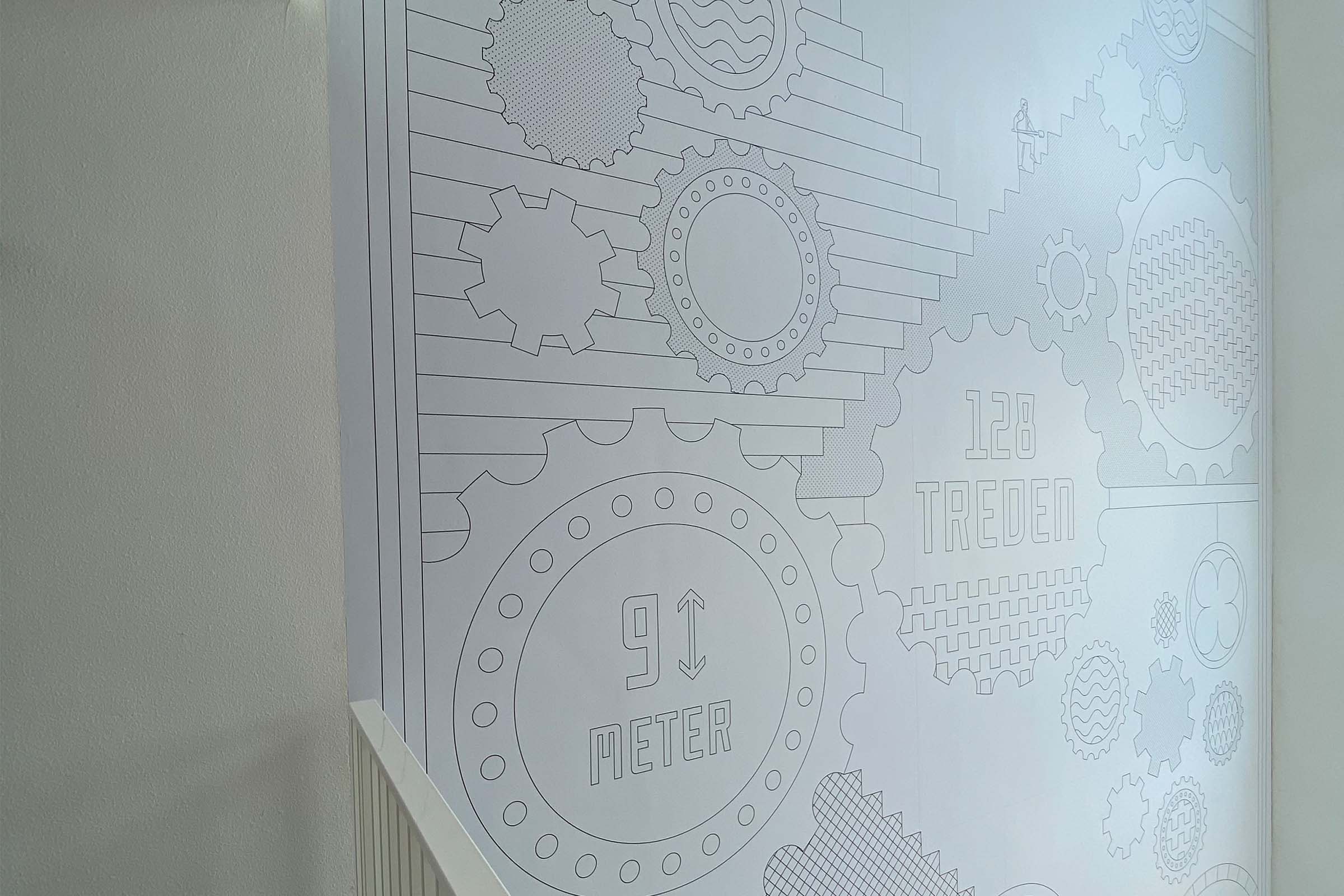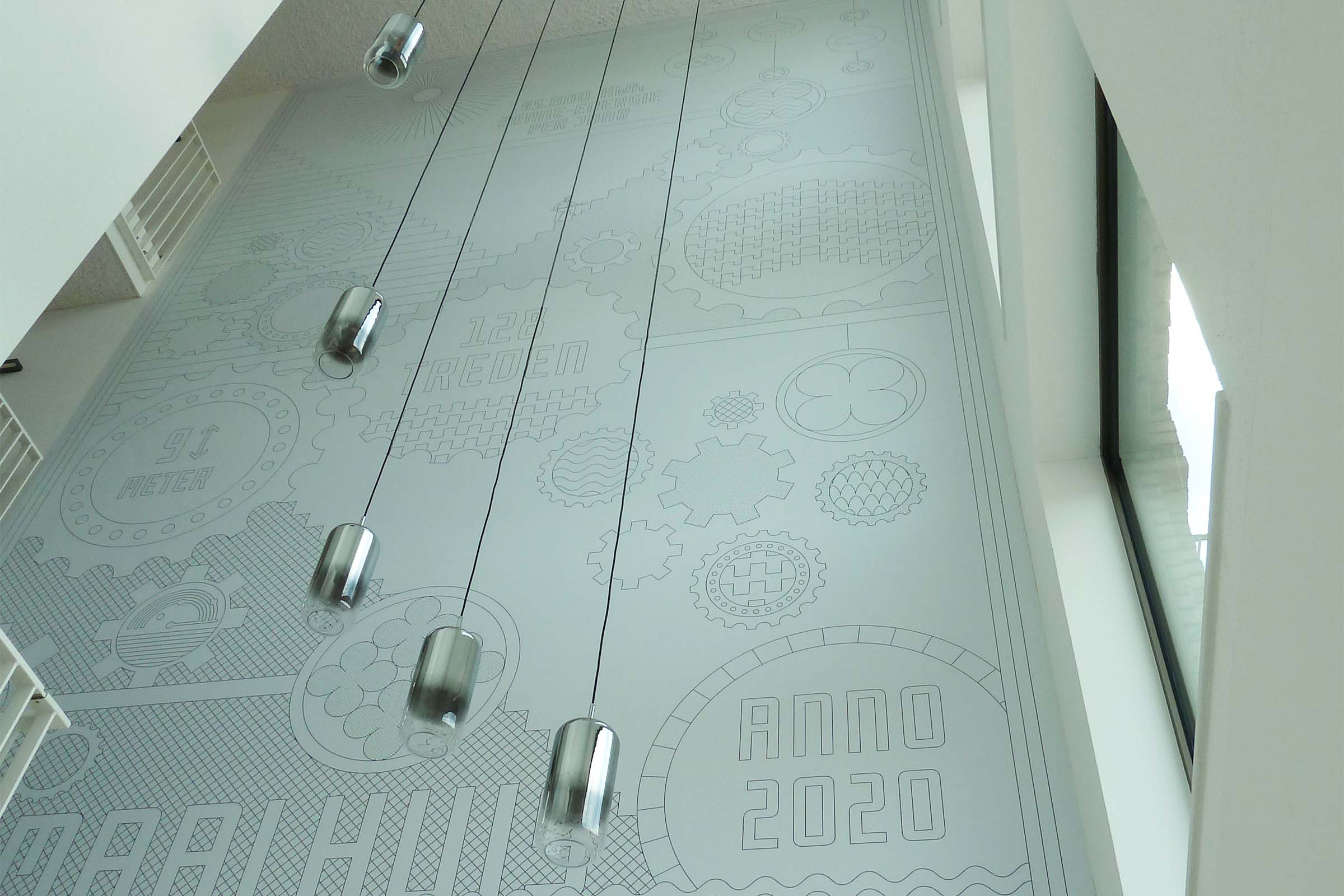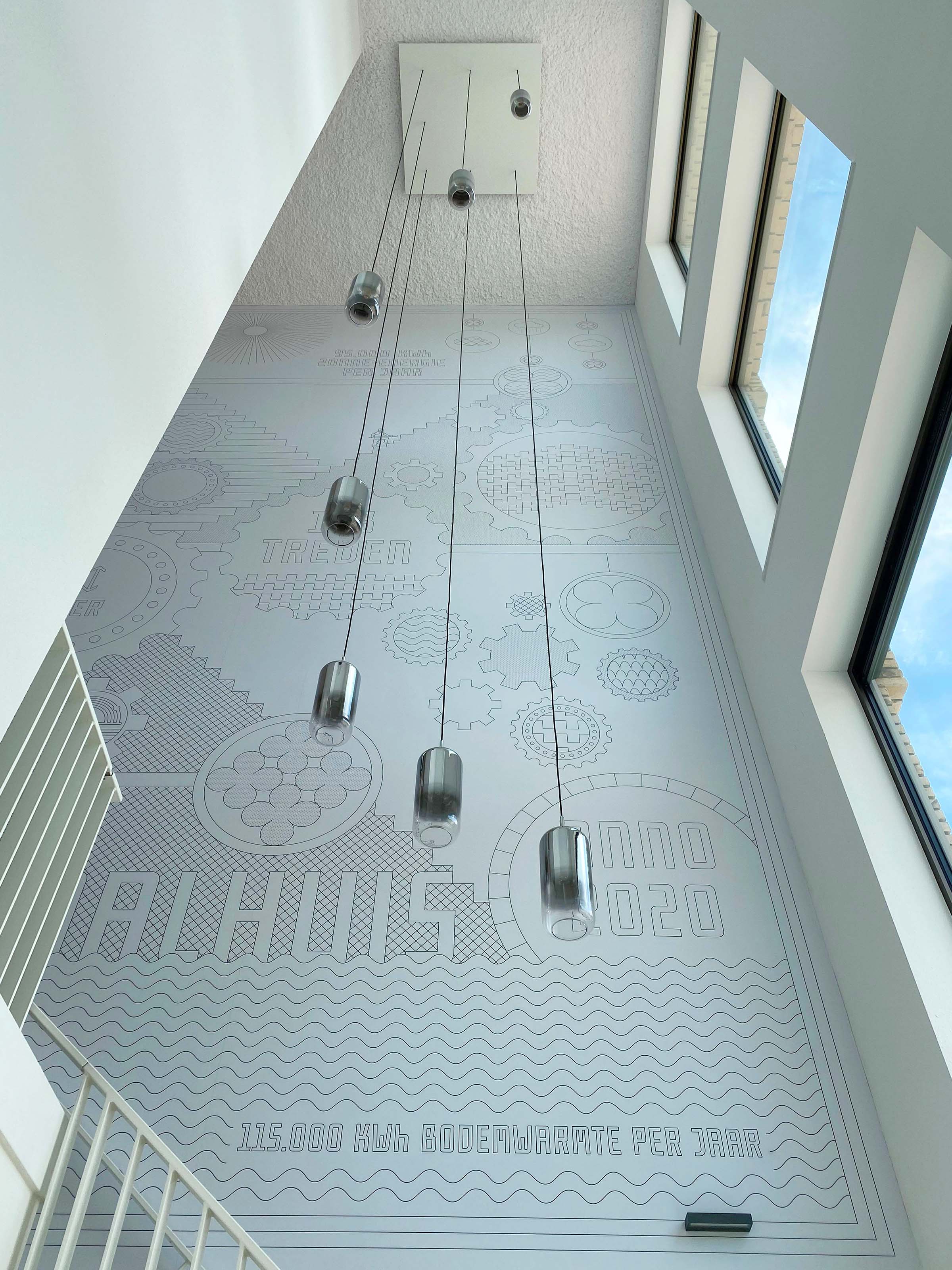 Hakijk maakte een ontwerp voor de twee entrees van het nieuwe appartementencomplex Gemaalhuis. Met het Cruquiusgemaal als inspiratiebron ontwikkelden we een grote illustratie (van 9.00 m x 5.50 meter in de entreehal en werd een bijpassende signing van typografie in staal toegepast op de verdiepingen van het gebouw.