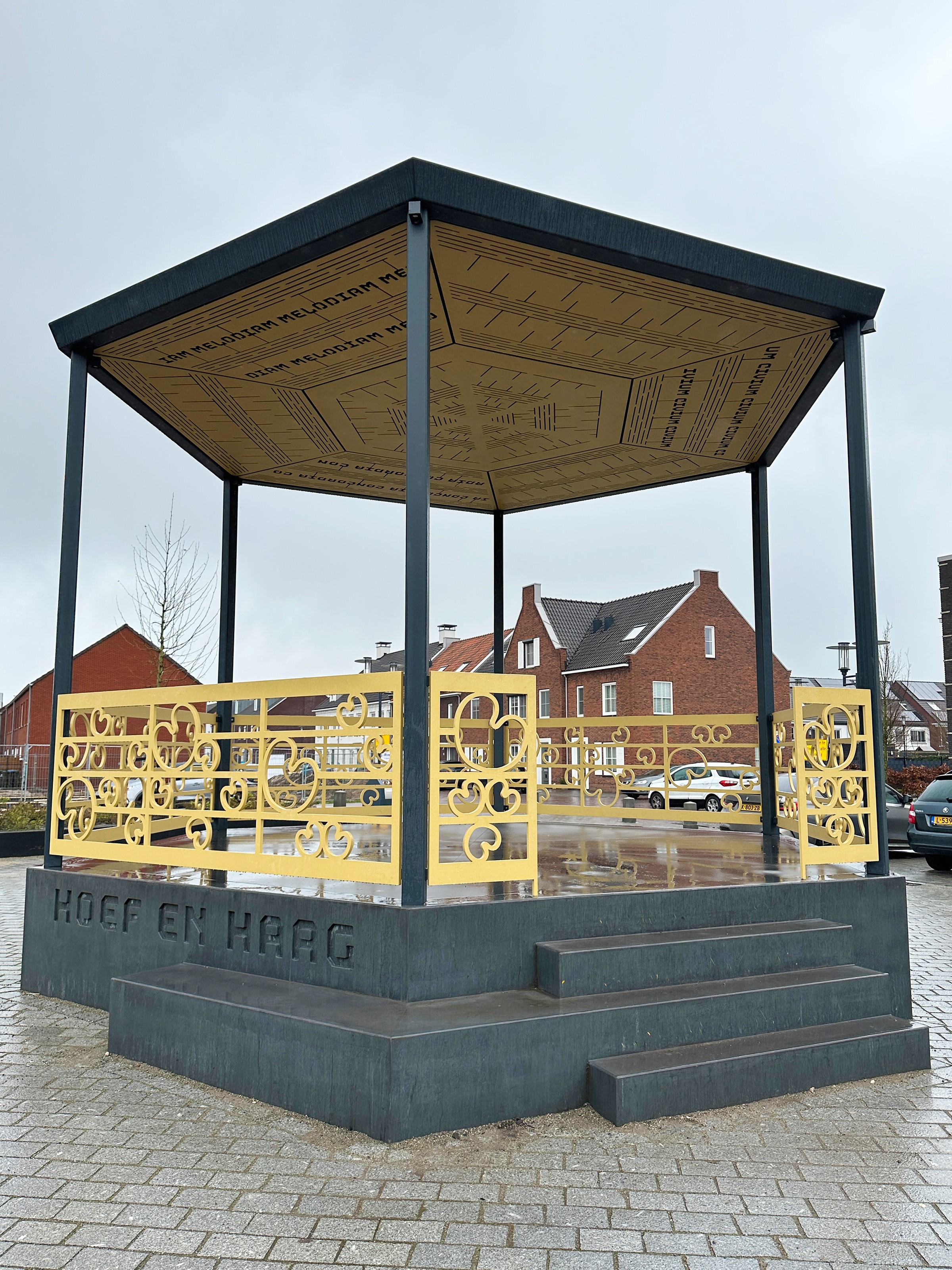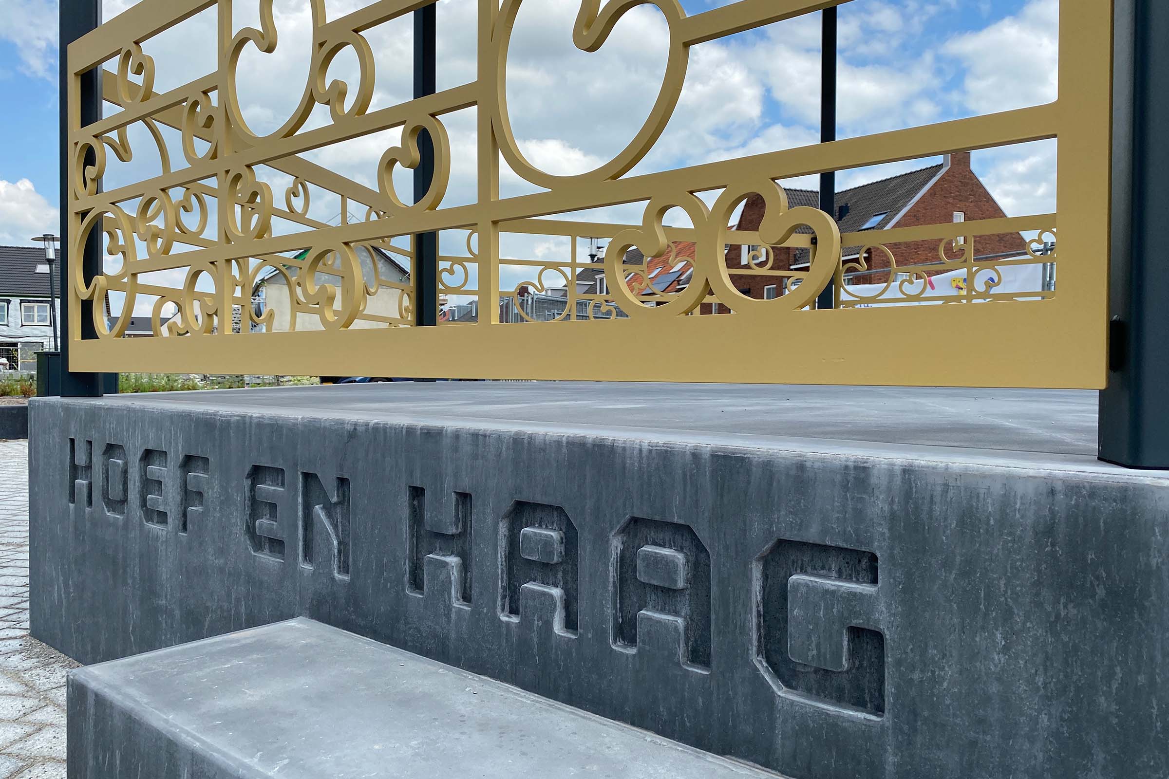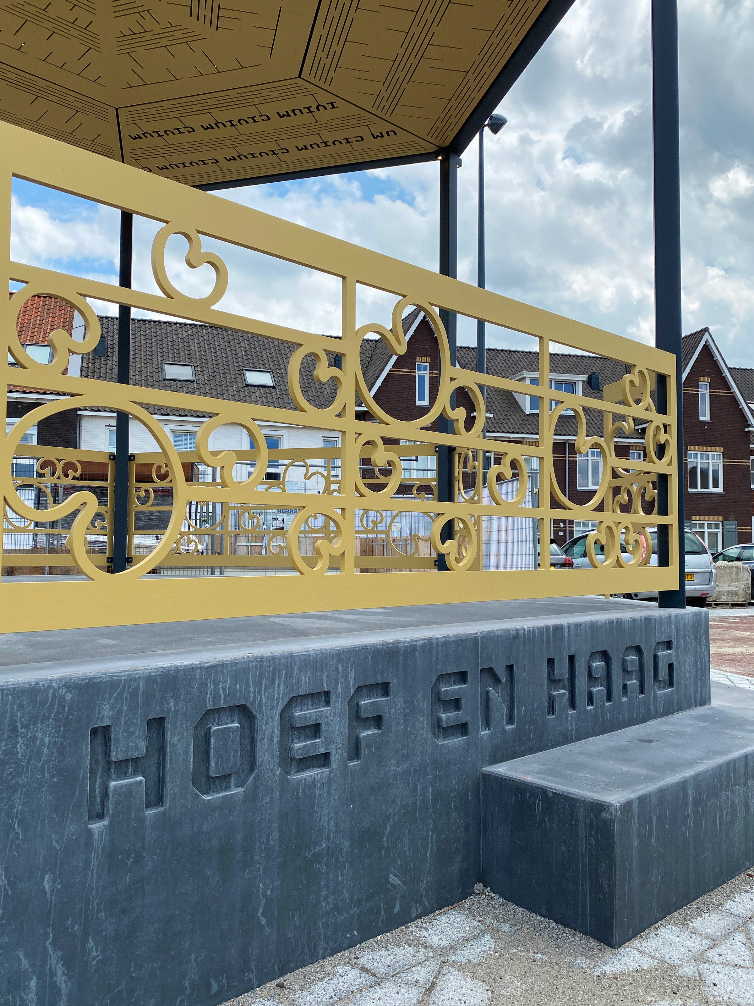 Voor Hoef en Haag mocht ik een aantal objecten van typografische vormgeving/concept voorzien met een verwijzing naar het verleden. De markthal is alst eerste afgerond en in december 2020 geplaatst. In 2022 volgden de muziektent, waterpomp en een winkelwagenvanger. Dit project was in samenwerking met SVP architectuur en Stedenbouw BV, Frank van Rijn Smederij. In opdracht van BPD.